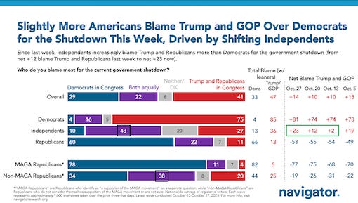 Meanwhile, poll after poll shows that Trump and Republicans continue to be blamed for the shutdown more than Democrats by double-digit margins. For example, the latest poll from Navigator, taken the week of Oct. 29th, shows that Americans now blame Trump and Republicans for the shutdown by 14 points, up from 10 points last week: