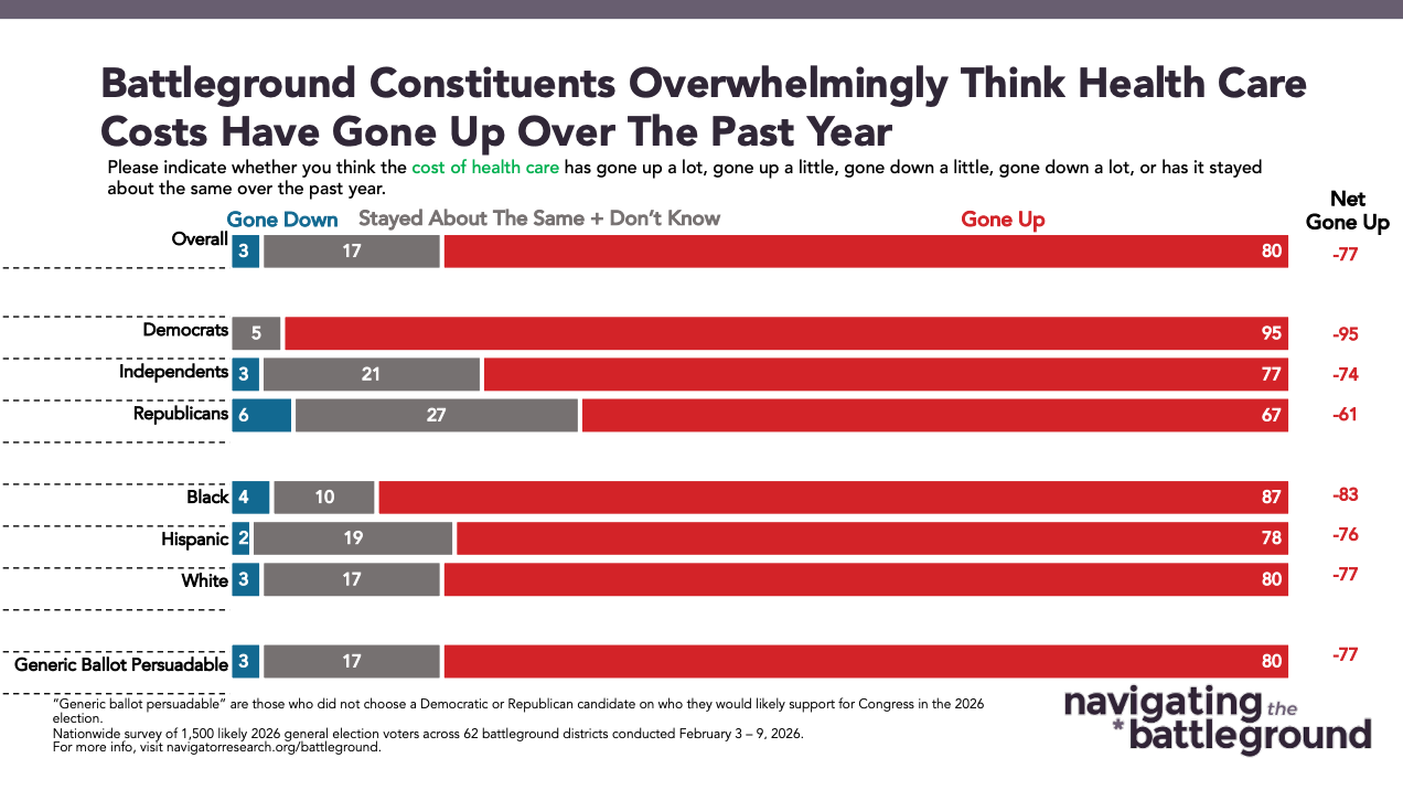 Battleground constituents overwhelmingly say that health care costs have gone up over the last year.
