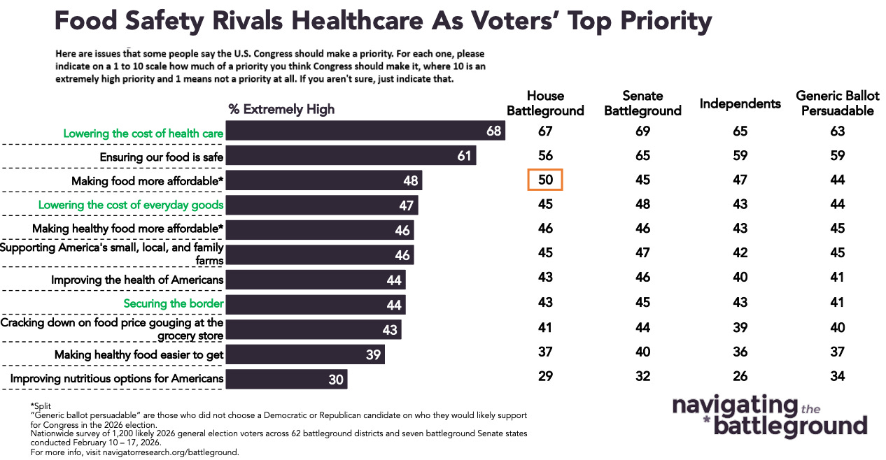 Navigator also has a new poll titled, “Perceptions of Food and Ag Policy in the House and Senate Battlegrounds” that polled constituents in 62 battleground congressional districts and seven battleground Senate states. The top concern of those polled was “Lowering the cost of health care” (68%.) That was followed closely by food safety (61%.)