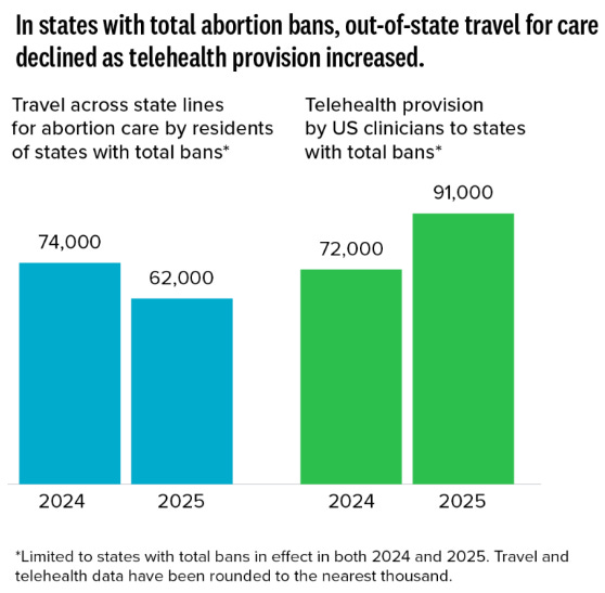 A new study by Guttmacher shows that, while the number of people in states with abortion bans who traveled to another state to get an abortion fell in 2025, the number who used telehealth (i.e., were prescribed abortion pills) is UP: